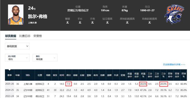 上海队除了古德温可以使用,但另外三个外援都不行,洛夫顿状态严重下滑,辽宁队旧将弗格更是严重下滑,比洛夫顿有过之而无不及。打了几个场比赛,弗格有三场得分4分4分和3分,其中有 一场4中0,运动战一分不得。到目前为止,弗格场均只得7分,投篮命中率28%,三分命中率20%,可以称得上是断崖式下滑。弗格曾是辽宁队三连冠功臣,上季常规赛场均可以得23分,可是季后赛只得11分,反映了他的真实水平。